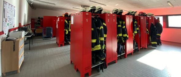 Neben der Fahrzeughalle mit 4 Boxen inkl. Erhaltungs-Ladegeräten für die Fahrzeugbatterien und Druckluft-Anschlüssen, verfügt das Erdgeschoss über eine Werkstatt, ein Büro, sanitäre Anlagen und eine Umkleide. Dort kann jedes Feuerwehrmitglied u.a. die persönliche Schutzausrüstung unterbringen.