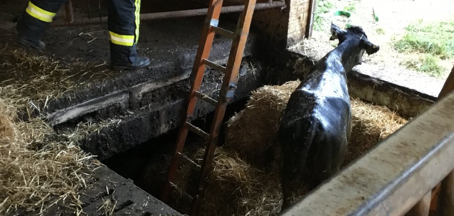 Aufgrund einer gebrochenen Standplatte in einem Rinderstall kam es am Sonntagabend zu einem Einsatz der Feuerwehr Oelde. 7 Rinder sind in eine Güllegrube unterhalb der gebrochenen Standplatte gefallen, eines der Tiere wurde durch Trümmer eingeklemmt.