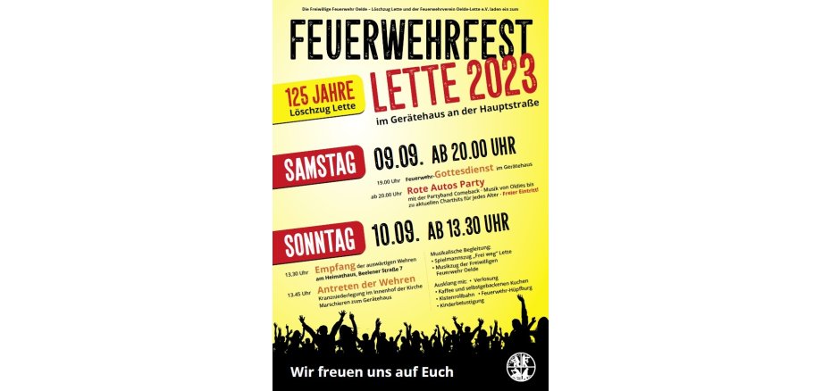 Am zweiten Wochenende im September ist es wieder soweit. Der Löschzug Lette lädt wieder zu seinem Feuerwehrfest an das Gerätehaus an der Hauptstraße ein.