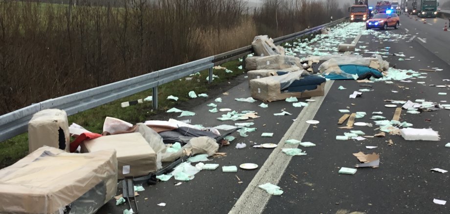 Gegen 08:30 Uhr wurden die Feuerwehr und der Rettungsdienst auf die A2 in Fahrtrichtung Oberhausen alarmiert. Dort war ein mit Stückgut beladener LKW auf eine Sicherungsfahrzeug aufgefahren und hatte sich die rechte Fahrzeugseite aufgerissen. Bei Eintreffen der ersten Kräfte waren Teile der Ladung auf der rechten und mittleren Fahrspur verteilt. Die Mitarbeiter einer Firma, die mit Instandsetzungsarbeiten an der Leitplanke beschäftig waren, blieben zum Glück unverletzt. Auch die beiden Insassen des verunfallten LKW blieben unverletzt. Um die Autobahn von der verlorenen Ladung zu befreien, es handelte sich u. A. um Einrichtungsgegenstände und Servietten , wurde der Straßenbaulastträger verständigt. Diese übernahmen im Verlauf die Absicherung der Einsatzstelle von der Feuerwehr. Nach anderthalb Stunden konnte der Einsatz für die Feuerwehr beendet werden.